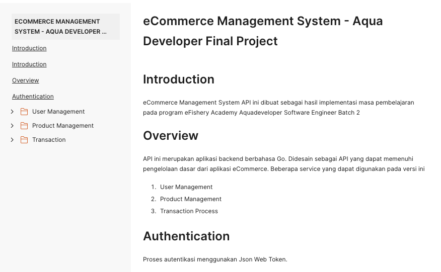 This project is a Go-based Backend API service as a part of Final Project of eFishery Academy Aqua Developer Batch 2 in October 2022. An API with eCommerce fungsionality including user management, product management, and transaction process (cart and order). Build it 100% Go Language Programming, Compatible to run with Docker